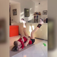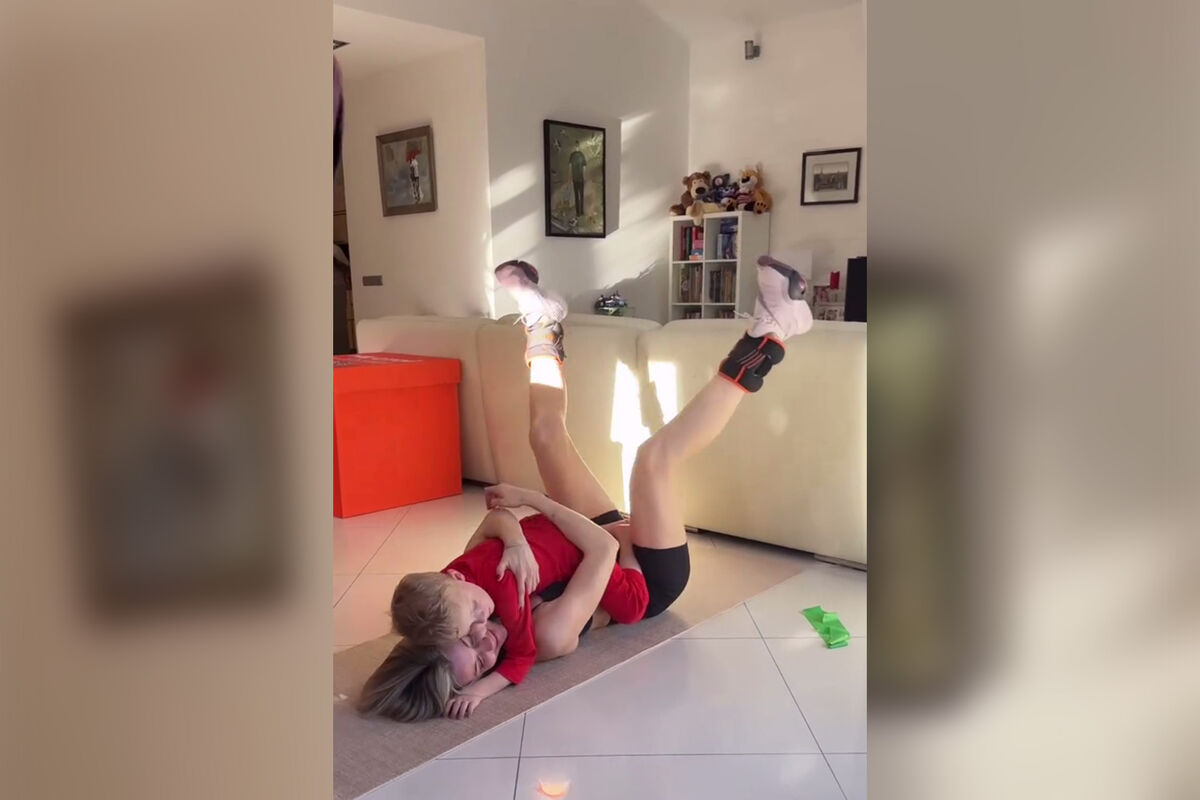 Юлианна Караулова сфотографировалась в черных велосипедках и спортивном топе. Образ дополнили кроссовки и грузы на ногах. Выполняя упражнения для ног, она положила сына на живот.
