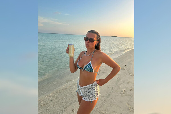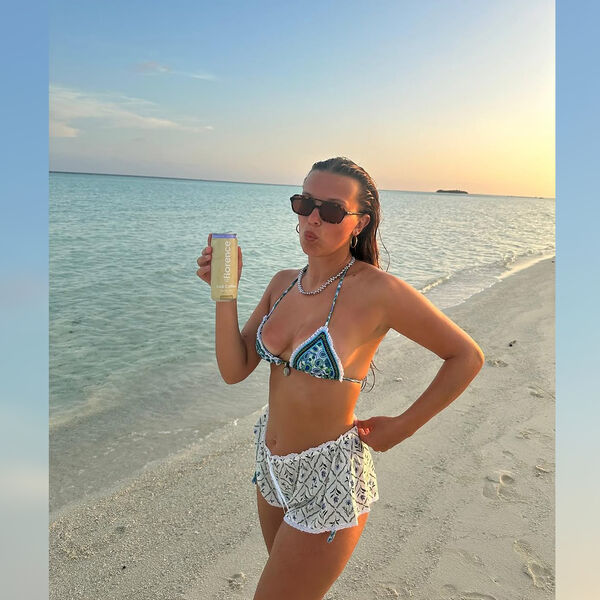 21-летняя Милли Бобби Браун после окрашивания в блонд решила вернуться к каштановому цвету волос. Актриса позировала в крошечном голубом лифе бикини, который дополнила молочными шортами с принтом, ожерельем, серьгами-кольцами и солнцезащитными очками с леопардовым принтом. Знаменитость снялась с банкой кофейного напитка на пляже.