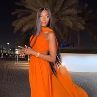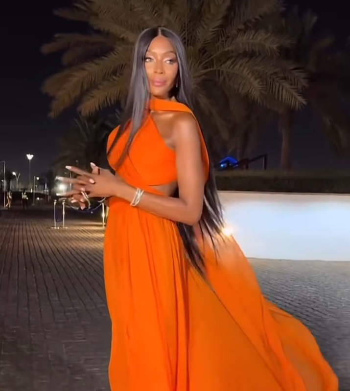 Наоми Кэмпбелл позировала в оранжевом платье из легкой ткани с голой спиной и открытыми руками. Волосы она распустила и сделала вечерний макияж. Модель посетила одно из мероприятий в Абу-Даби.