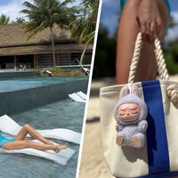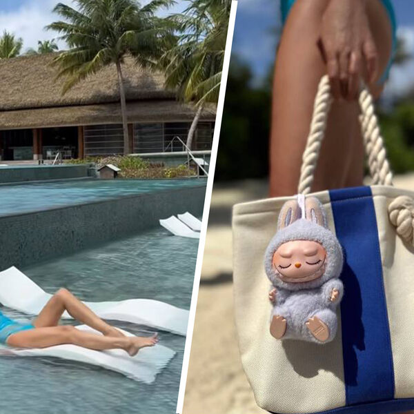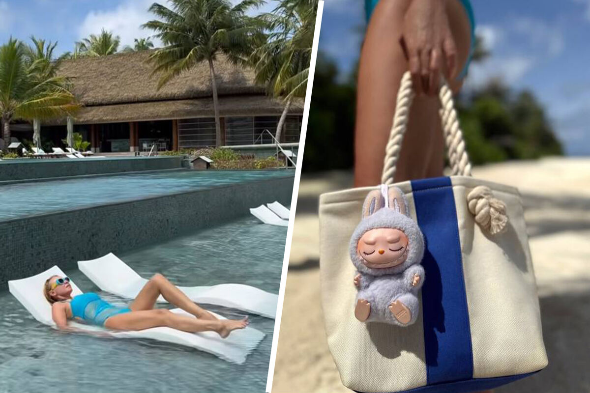 Яна Рудковская позировала в голубом купальнике с голой спиной. Образ дополнила пляжная сумка, к которой прикрепила брелок Labubu. Его стоимость составляет от 10 тысяч рублей.