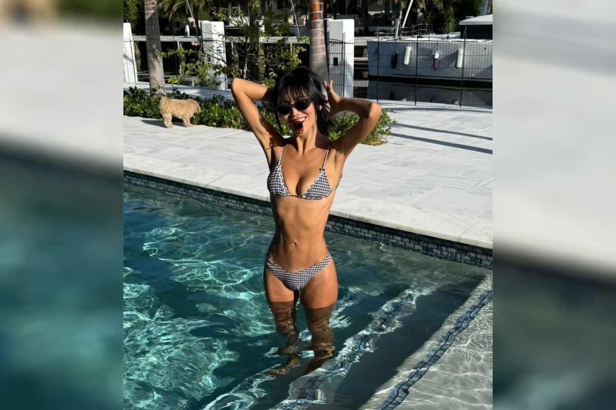 Дарина Эрвин предстала перед камерой в клетчатом крошечном бикини и черных солнцезащитных очках. Жена Александра Цекало стояла в бассейне с собранными волосами и без косметики.