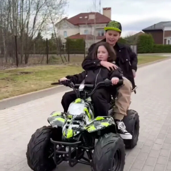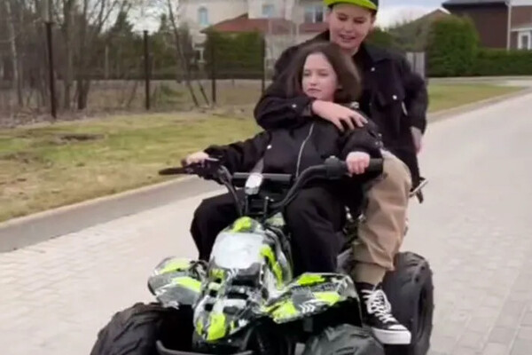 Жена Павла Прилучного засняла, как 9-летняя Мия катается на квадроцикле вместе с 12-летним братом Тимофеем загородом. Мальчик обнимает сестру, пока та сидит за рулем.