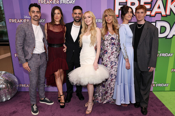 Линдси Лохан предпочла для выхода белое платье Jacquemus с асимметричной юбкой и сеткой. Образ она дополнила золотыми босоножками на каблуках и ожерельем. Волосы ей уложили мягкими прядями и сделали макияж со стрелками. Перед папарацци она появилась вместе с мужем Бадером Шаммасом, матерью Диной, братом Майклом, сестрой Алианой и братом Дакотой.