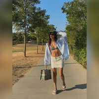 24-летняя Виктория Антонова предстала перед камерой в сером лифе бикини, который сочетала с голубой рубашкой, белой джинсовой мини-юбкой и кепкой. Жена Александра Петрова добавила к пляжному образу солнцезащитные очки, цепочку с кулоном, белые вьетнамки и сумку Dior. Девушка позировала с мокрыми распущенными волосами и без косметики.