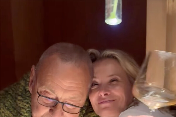 52-летняя Высоцкая позировала в объятиях мужа в ресторане. Актриса была одета в белый лонгслив, а ее муж Кончаловский — в зеленый трикотажный кардиган.