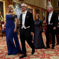 31-летняя Тиффани Трамп присоединилась к Дональду Трампу и его супруге Мелании на государственном банкете, организованном по случаю их визита в Великобританию. На встрече с королевской семьей девушка появилась в сопровождении своего мужа Майкла Булоса. Дочь президента США выбрала для закрытого мероприятия синее платье с открытыми плечами, которое было украшено стразами. Она дополнила образ браслетом, кольцом, серьгами и колье. Бизнесвумен уложили волосы в локоны и сделали вечерний макияж.