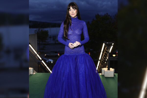 Дакота Джонсон появилась на мероприятии в ярко-синем платье с облегающим прозрачным верхом и пышной юбкой, отказавшись от бюстгальтера. Волосы ей распустили и сделали вечерний макияж с угольно-черными стрелками и подводкой.