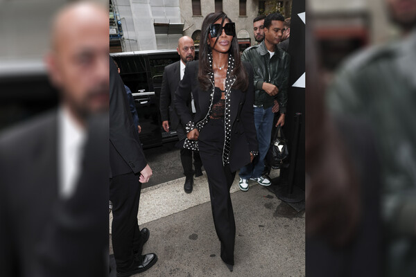 55-летнюю Наоми Кэмпбелл подловили папарацци 27 сентября во время Недели моды в Милане. Супермодель заметили перед показом Dolce & Gabbana. Манекенщица вышла в свет в черном топе из прозрачного кружева, жакете, туфлях на каблуках и массивных солнцезащитных очках. Звезда подиумов появилась на публике с уложенными волосами и макияжем в естественном стиле.