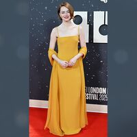 Эмма Стоун позировала в желтом платье-комбинации с разрезом до бедра и накидкой в тон. Волосы актрисе уложили волнами и сделали макияж с бордовой помадой.