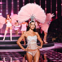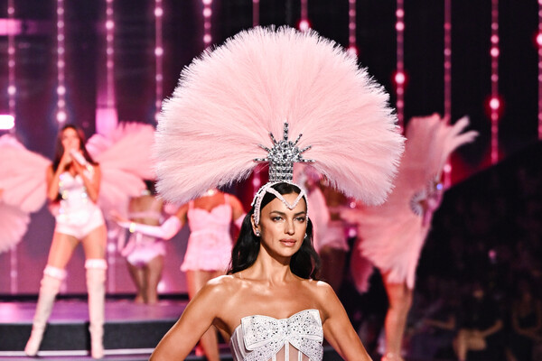 39-летняя Ирина Шейк вышла на подиум в белом полупрозрачном корсете с бантом и стрингах, которые были украшены стразами. Образ супермодели дополнили головной убор с розовыми перьями и прозрачные босоножки на каблуках. Манекенщице уложили волосы и сделали макияж с блестящими тенями и помадой. Она также примерила образ в красном цвете, который состоял из бюстгальтера, юбки с разрезом до бедра и босоножек на каблуках.