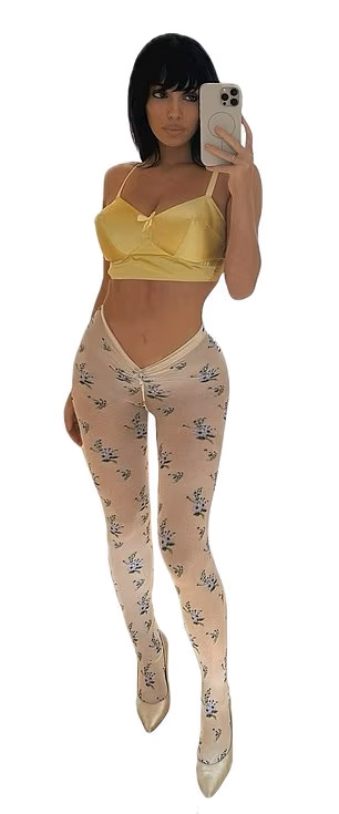 На одном из кадров Бьянка Цензори предстала в желтом бюстгальтере с конусами, который дополнила полупрозрачными белыми лосинами с цветочным принтом и блестящими атласными туфлями на каблуках. Модель была запечатлена с распущенными волосами и макияжем с темными тенями. На других снимках жена Канье Уэста позировала в похожих образах в ретро стиле.