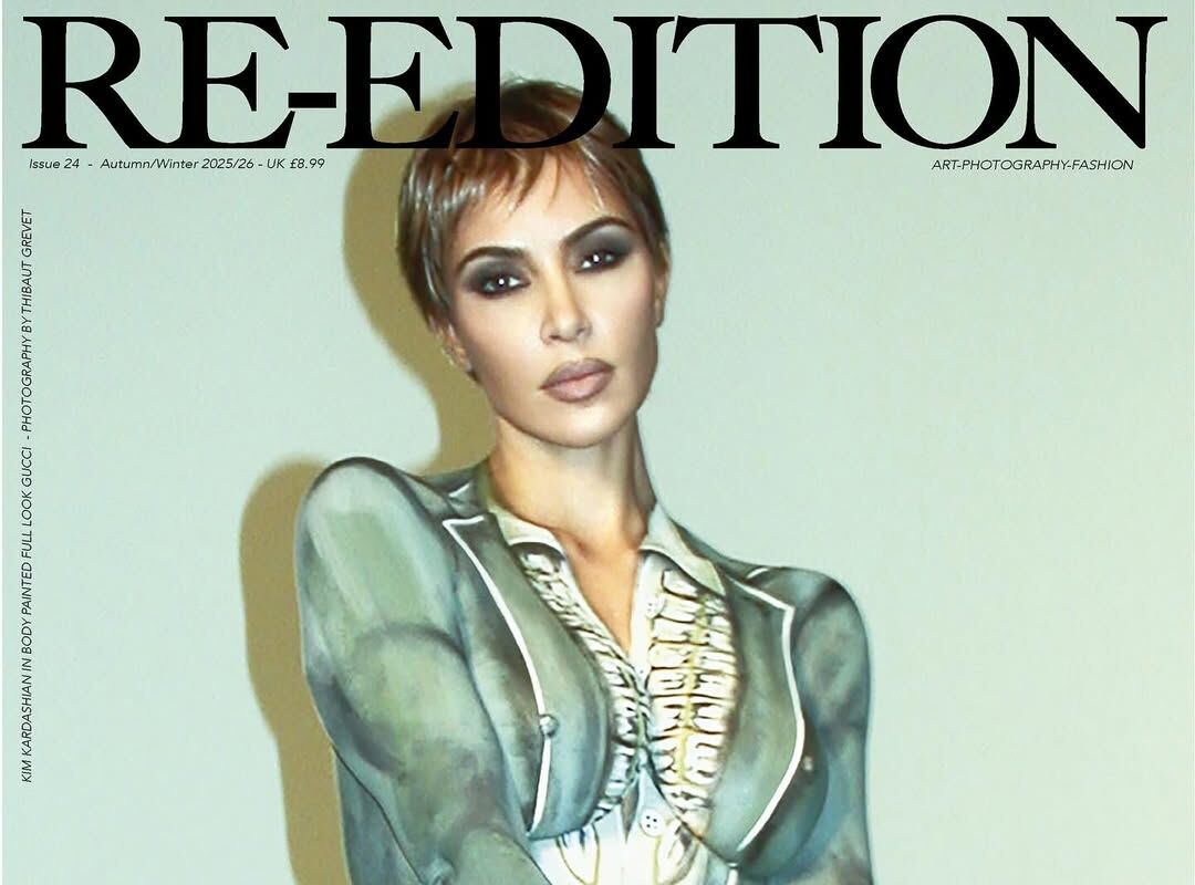 45-летняя Ким Кардашьян стала героиней нового выпуска журнала Re-Edition. На обложке модель позировала без бюстгальтера. Тело звезды реалити-шоу было разрисовано бодиартерами Future Rep и Афиной Пагинтон. Художники изобразили на бизнесвумен образ из новой коллекции Gucci. Ким Кардашьян была запечатлена в парике со светлыми волосами и короткой стрижкой и макияжем с темными тенями и коричневой помадой. Автором съемки выступил фотограф Тибо Греве.