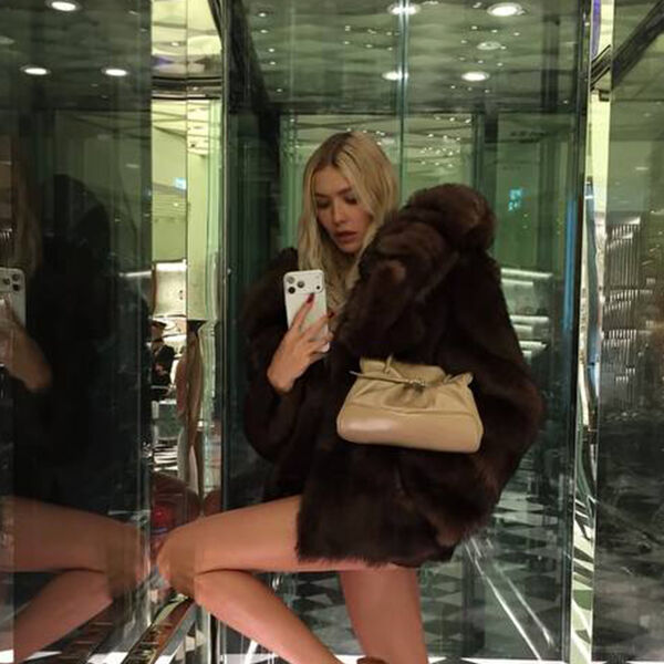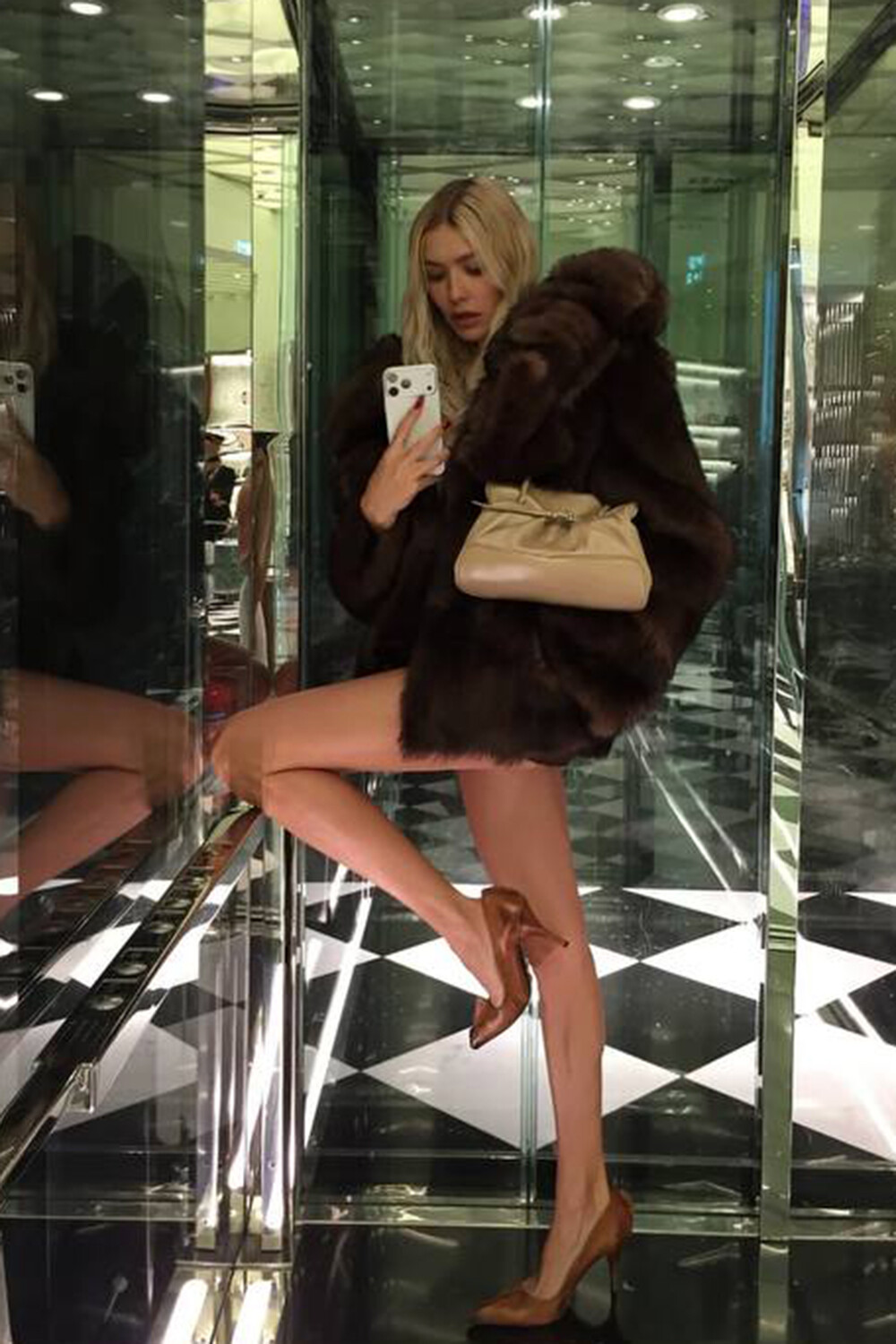 Елена Перминова в одной шубе на голое тело снялась в лифте. Образ дополнили туфли с острым мысом и сумка из кожи. Волосы она распустила и сделала легкий макияж.