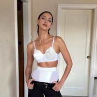 39-летняя Ирина Шейк позировала в белом бюстгальтере с острой грудью и черных брюках с белыми трусами. Волосы модели собрали в низкий пучок и сделали макияж с шоколадной помадой.