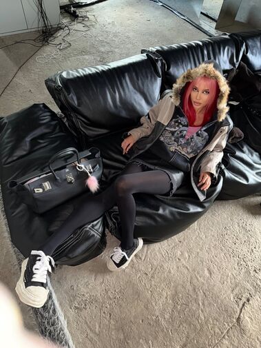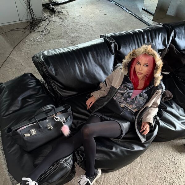 Анастасия Решетова предстала перед камерой в парике с ярко-розовыми волосами. Модель также сделала макияж с черными стрелками и нюдовой помадой. Блогерша была запечатлена в розовой майке, толстовке, куртке с мехом на капюшоне и мини-юбке. Образ знаменитости завершили капроновые колготки, кеды и сумка Hermes.