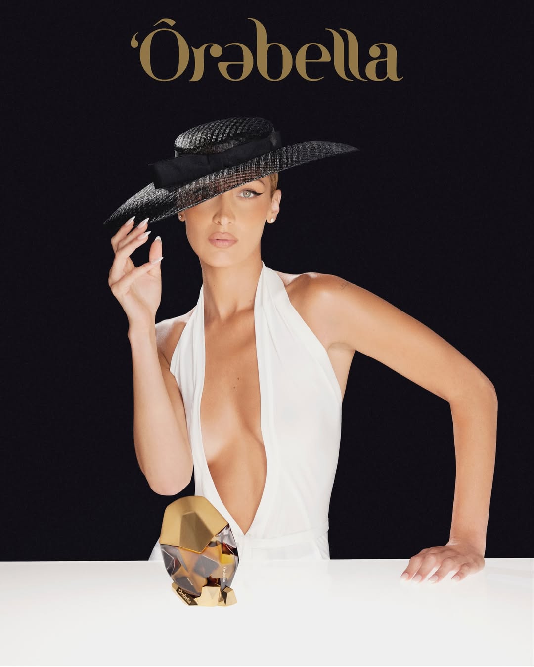 29-летняя Белла Хадид снялась в новой рекламной кампании собственного бренда парфюмерии Orebella. Супермодель предстала перед камерой в белом платье с декольте до пупка, под которое не стала надевать бюстгальтер. Образ манекенщицы дополнили черная шляпа и серьги с бриллиантами. Знаменитости уложили волосы под головной убор и сделали макияж с черными стрелками и нюдовой помадой.