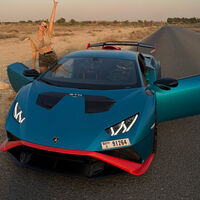 Елена Перминова позировала в пестрых шортах и бежевой футболке. Модель стояла рядом с машиной Lamborghini в пустыне во время отдыха с возлюбленным в Дубае.