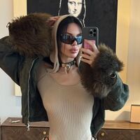 Оксана Самойлова вышла на публику в спущенных зеленых штанах с черными стрингами, бежевом топе и меховой куртке. Образ дополнили очки, ремень и чокер с цепями.