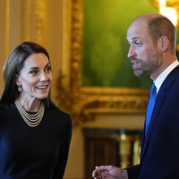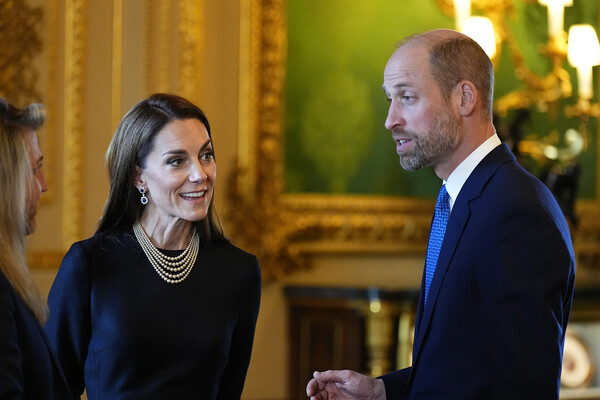 Для выхода Кейт Миддлтон выбрала черное платье, дополнив образ жемчужным ожерельем и серьгами принцессы Дианы. Перед камерами принцесса появилась вместе с принцем Уильямом.