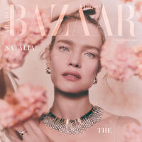 На обложке 43-летняя Наталья Водянова предстала в розовом наряде, который дополнили ювелирные украшения Chaumet: серьги, массивное колье и кольцо. Супермодели собрали волосы в пучок и сделали макияж в нюдовых тонах.