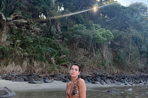 На одном из кадров Дуа Липа предстала в леопардовом крошечном бикини, которое дополнила серьгами и кольцом. Певица позировала с собранными волосами и без косметики в воде на фоне горы с растительностью.