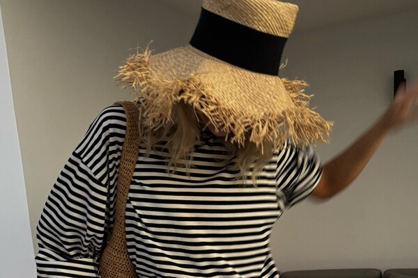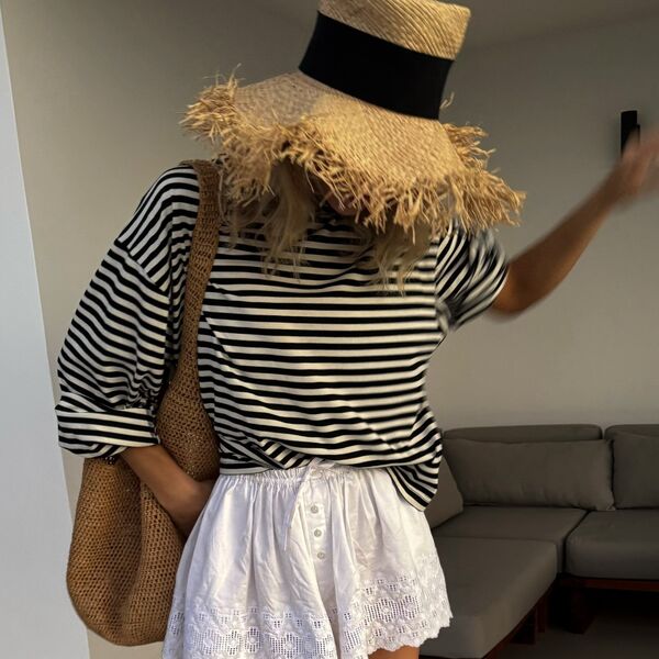 Эльза Хоск позировала в белой мини-юбке и полосатом топе. Образ дополнила соломенная шляпа, бархатные балетки и сумка из джута. Волосы модель распустила и отказалась от макияжа.