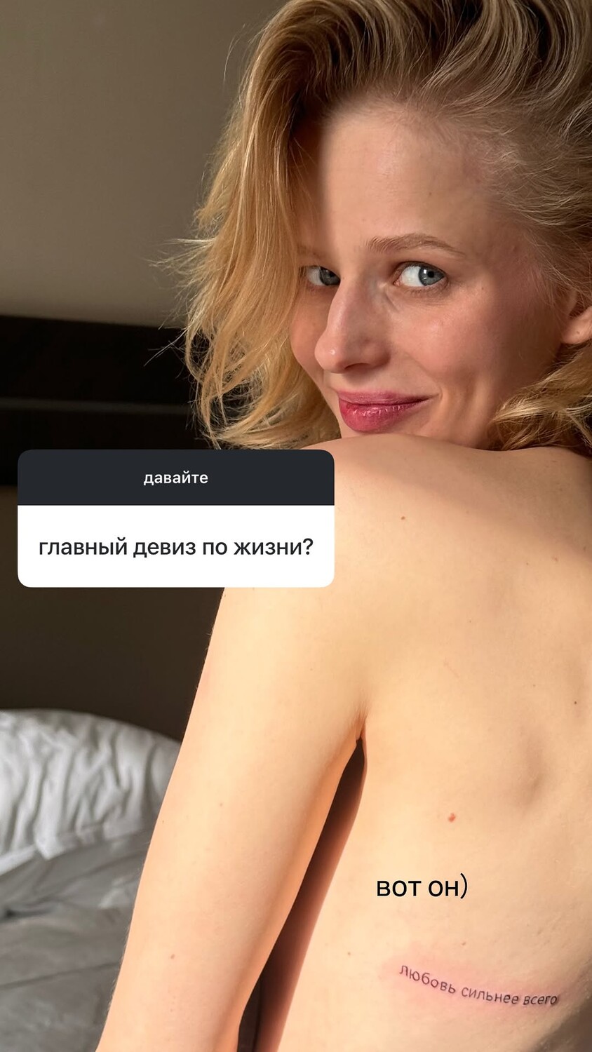 31-летняя Саша Бортич сидела на кровати, повернувшись спиной к камере. Актриса показала татуировку с надписью «Любовь сильнее всего», которую набила на спине. Знаменитость позировала с распущенными волосами и без макияжа.